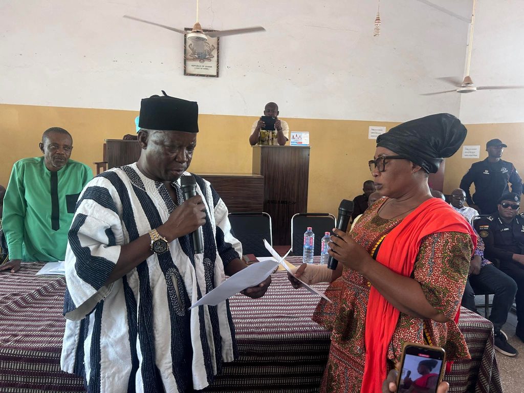 The Upper East Regional Minister, Hon. Akamugri Donatus Atanga, swore in Mrs Diana Asoketarige Ayamga as the new District Chief Executive (DCE) of the Bongo District Assembly after she secured 44 “yes” votes against 10 no votes,.Mr Donatus Akamugri urged assembly members to vote unanimously in honour of the late DCE, Mr. Joseph Abaah Akansake.